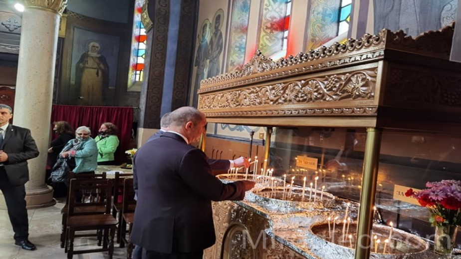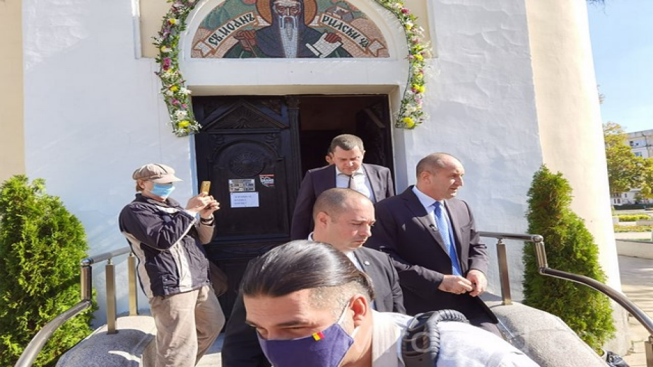 Държавният глава влезе в черквата „Св. Иван Рилски“, където запали свещ за здраве. На излизане пък получи букет от здравец от жената, която продаваше цветя през храма. След това Радев се отправи на среща с интелектуалци и спортисти на Перник. На нея присъстваха световния шампион по борба Иво Ангелов, етнологът Цветана Манова, пернишката футболна легенда Велизар Димитров, световната шампионка по таекуондо Василена Йорданова и др.