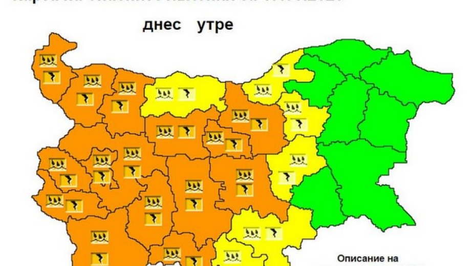 Оранжев код за опасно време днес - обилен дъжд с гръмотевици в 15 области в страната - Видин, Монтана, Враца, Велико Търново, Ловеч, Габрово, София-област, София-град, Пазарджик, Пловдив, Стара Загора, Благоевград, Кюстендил, Смолян и Перник.