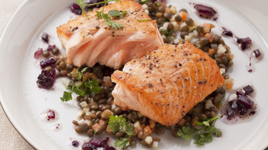 Върху лещата се слага сьомгата. Полива се с лучения сос.