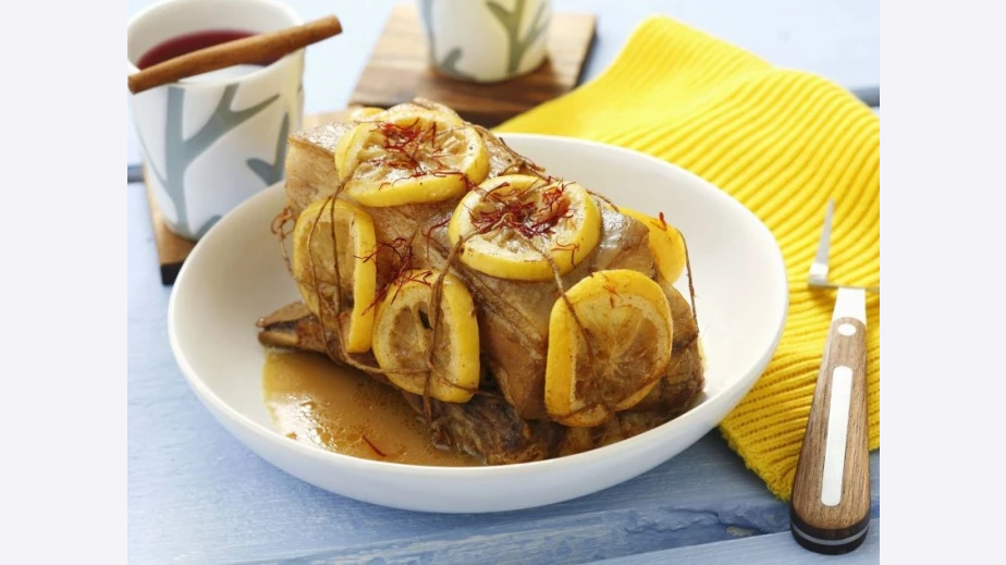Лимонът се нарязва на много тънки кръгчета. Поръсват се с шафрана.