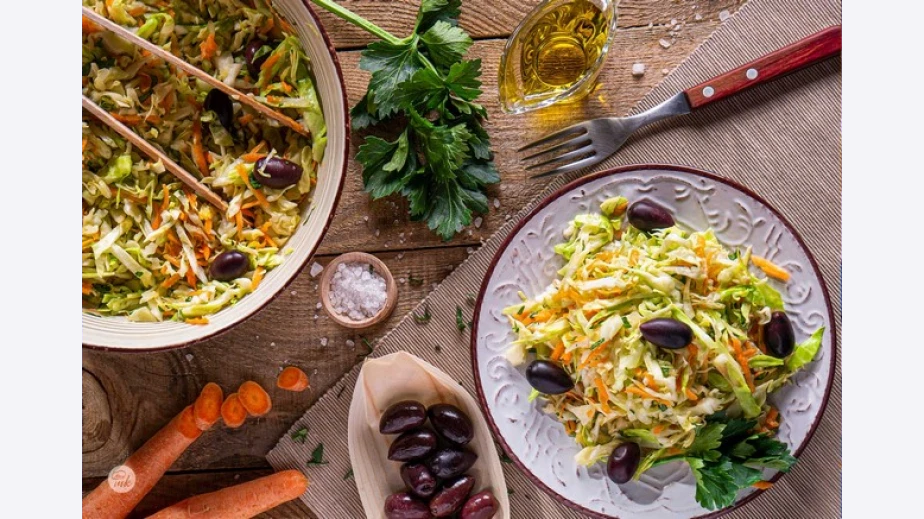 Украсете с маслините и сервирайте свежата салата от зеле, моркови и целина в дълбока купа. Тя е чудесна гарнитура за печено във фурна или на скара месо. /Рецепта на matekitchen.com