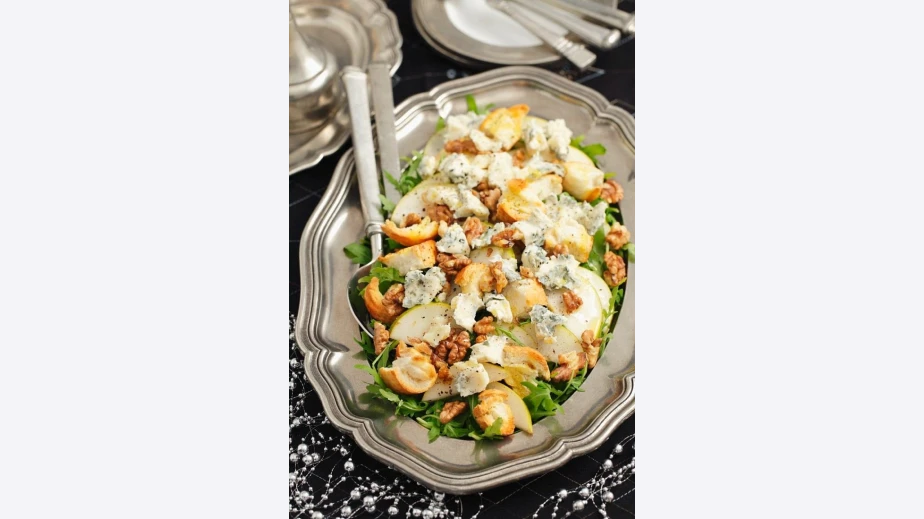 Крушите се подреждат върху руколата. Поръсват се хлябът, едро нарязаните орехи и 2/3 от натрошеното синьо сирене.