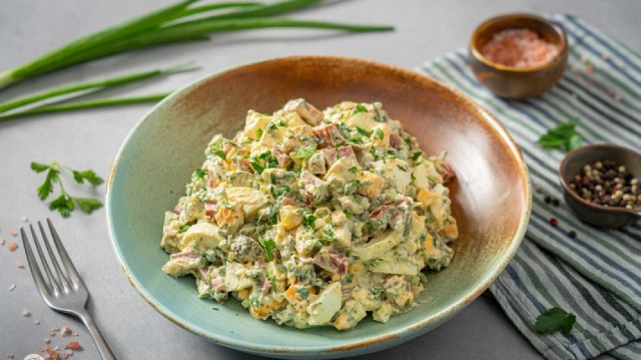 Сложете нарязаните яйца в купа и към тях прибавете нарязаните кисели краставички, салама, лука, майонезата, горчицата и всички подправки.