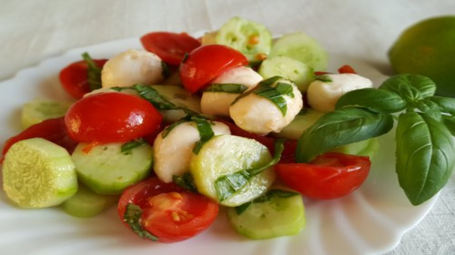 На върха й пък наредете чери доматките, които може да нарежете на половина.