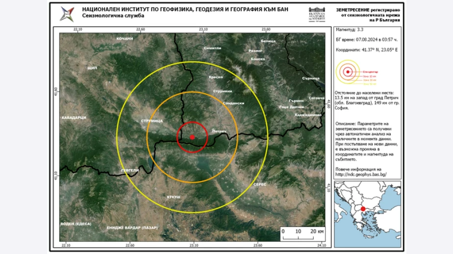 Поредица земетресения в района на Петрич, област Благоевград. Те са били с магнитуди съответно 3.5 в 3:57 ч, 2.4 в 4:46 ч., 2.6 в 6:41 ч и 2.1 в 9:53 ч.