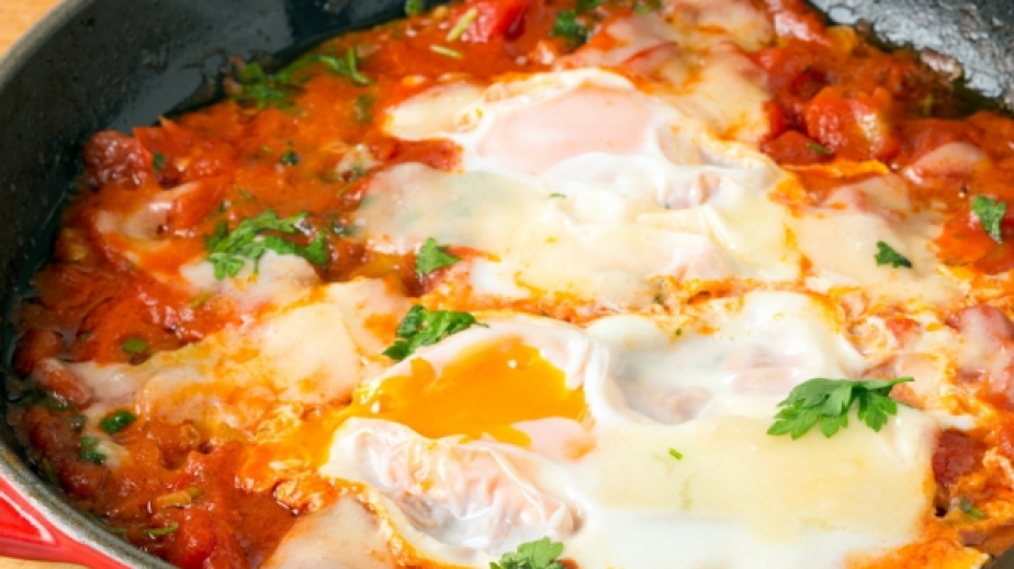 Ястието трябва да се приготви в голям тиган. Загрейте зехтина в него и добавете скълцаните лук и чесън. След като се запържат за около 5 минути, добавете нарязаните чушки и запържете, докато омекнат.Добавете доматите, предварително нарязани и заедно със сока от консервата, ако използвате консервирани. Добавете 1-2 щипки захар, разбъркайте и след като ястието заври, овкусете с останалите подправки, като най-накрая посолите. Количеството на подправките зависи от собствения ви вкус.След като сосът се сгъсти, чукнете яйце отгоре внимателно отгоре на разстояние едно от друго. Сложете капак на тигана и гответе 10-15 минути - яйцата трябва да се стегнат, а доматеният сос леко да се карамелизира. Накрая поръсете с накълцан магданоз и поднесете.