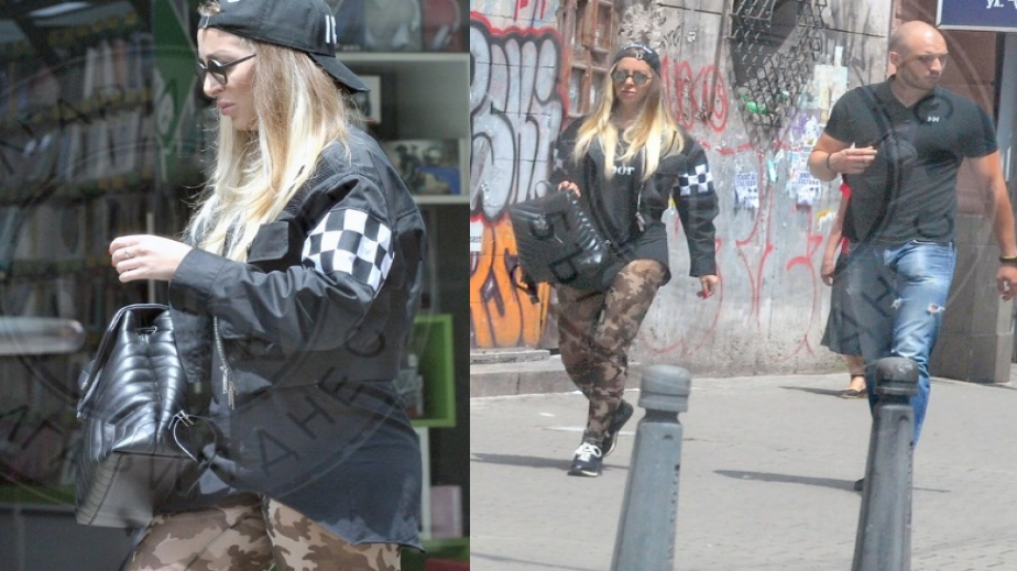 Чаровната блондинка Веселина бе облечена в спортно по тийнейджърски с шапка, обърната с козирката назад, тъмни очила и клин в камуфлажен стил. Към стайлинга си е добавила маратонки и суичър.