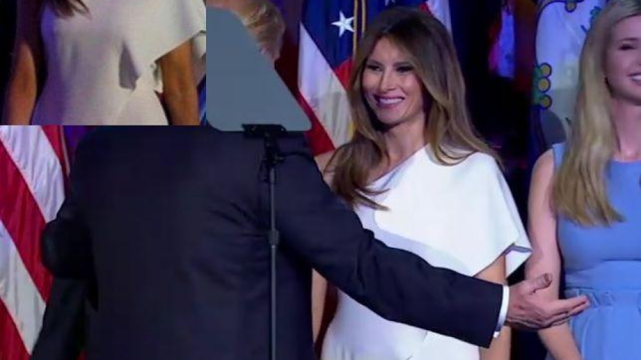 Гащеризонът на третата съпруга на Тръмп беше с дълги широки панталони, а горната му част беше с паднало рамо и нежни воали. Тук се вижда зърното на Мелания Тръмп. Малко след победната реч на Доналд Тръмп медиите в Америка започнаха да анализират облеклото и на Мелания, и на децата му, които бяха до него на трибуната, пише "24 часа".