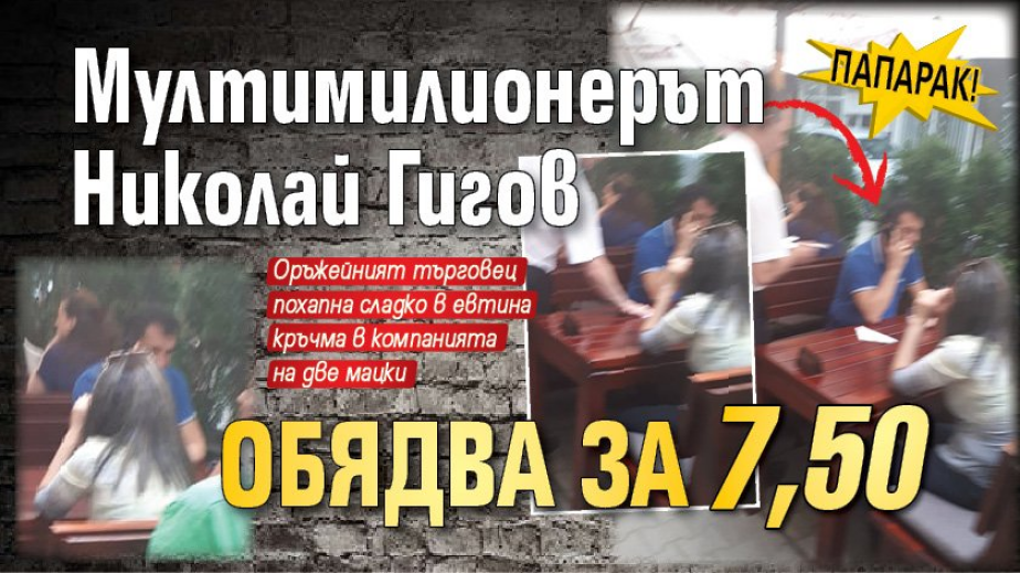 Оръжейният търговец Николайчо Гигов беше изловен от бдителен репортер на Lupa.bg да обядва в повече от скромно заведение в центъра на София днес. Мултимилионерът похапваше обедно меню за 7,50 лв. в компанията на две симпатични дами, с които си хортуваше между хапките, пише lupa.bg