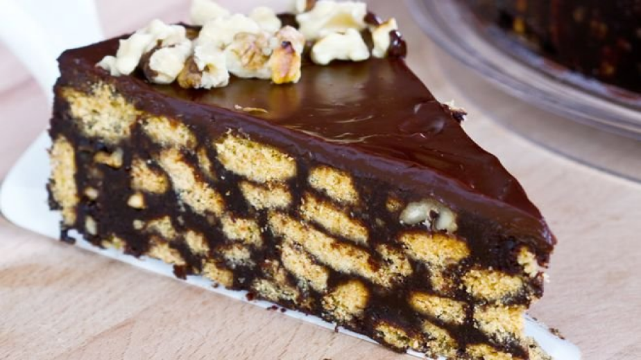 Нарязваме шоколада на парчета и ги оставяме да се разтопят на водна баня. Сипваме кафето към разтопения шоколад. Разбиваме яйцата с половината пудра захар, докато побелеят и ги прибавяме към шоколада. Отново слагаме на водна баня и разбъркваме, докато сместа започне да се сгъстява. Махаме от огъня и щом сместа изстине, прибавяме разбитото масло с останалата пудра захар и ванилията. Държим в хладилника, докато изстине. Подреждаме бишкотите в подходяща торта. Заливаме ги с портокаловия сок, в който предварително сме разтопили захарта. Намазваме бишкотите с крема и продължаваме да редим продукти в този ред, докато свършат. Прибираме тортата в хладилника за няколко часа. Преди да я сервираме, можем да я украсим по желание.
