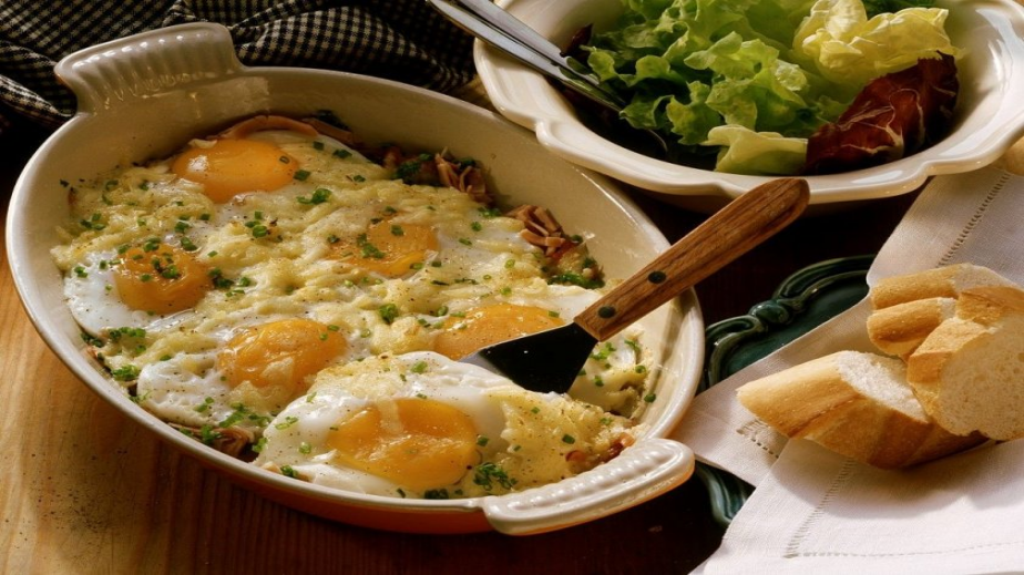 Чукват се отгоре яйцата цели и се запича в загрята умерена фурна до желаната консистенция на жълтъците.