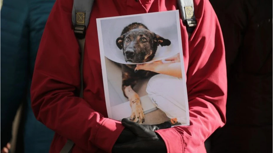 Пред Софийския районен съд имаше протестиращи с плакати на кучето Мечо и надписи "убиец" и "садист". /Източник: БТА