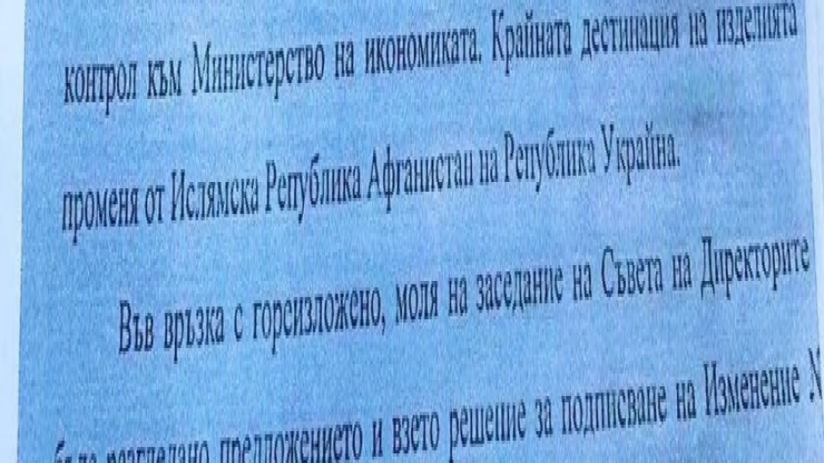 Главният секретар на президентството Димитър Стоянов показа част от документ, в който пише, че оръжейна пратка се пренасочва от Афганистан към Украйна. Той не уточнява за чие разпореждане става въпрос и дали извадката е от документ на Междуведомствена комисия за експортен контрол и неразпространение на оръжията за масово унищожение, която е на подчинение на вицепремиера, министъра на икономиката и енергетиката и лидер на БСП Корнелия Нинова. Само тази комисия има право да разрешава експорта на стоки с двойна употреба, пише Lupa.bg
