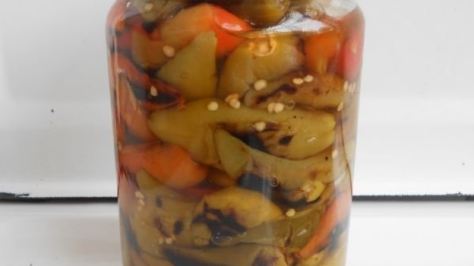 Скъсете максимално дръжките на чушките и ги запечете (изпукайте) на скарата. Докато са още топли ги поставете в голям буркан (800 мл), в който са сложени 4 с.л. олио, 5 с.л. оцет, 1 с.л. сол и 1 1/2 с.л. захар.