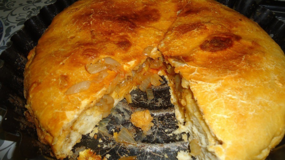 Едната топка тесто се разточва и се слага в тава, която е помазана с олио и е набрашнена. Отгоре се изсипва плънката от лука и се разпределя равномерно. Втората топка тесто също се разточва.