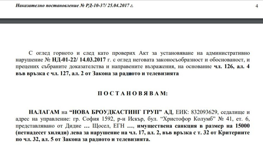 "Съгласно т. 32 от Критериите за оценка на съдържание, което е неблагоприятно или създава опасност от увреждане на физическото, психическото, нравственото и/или социалното развитие на децата, приети от СЕМ и ДАЗД на основание чл. 32, ал. 5 от ЗРТ, "доставчиците на медийни услуги не допускат предоставяне за разпространение на търговски съобщения - с участието на дете или насочени към деца - за наркотични вещества. Не допускат и предавания, с изключение на филми и сериали, в които се показват изображения, представляващи и наподобяващи наркотични вещества, и поведение, чието подражание може да създаде опасност за живота и здравето на детето", се казва в Наказателно постановление № РД-10-37/ 25.04.2017 г., подписано от неговия председател Мария Стоянова.