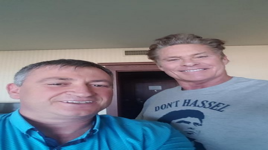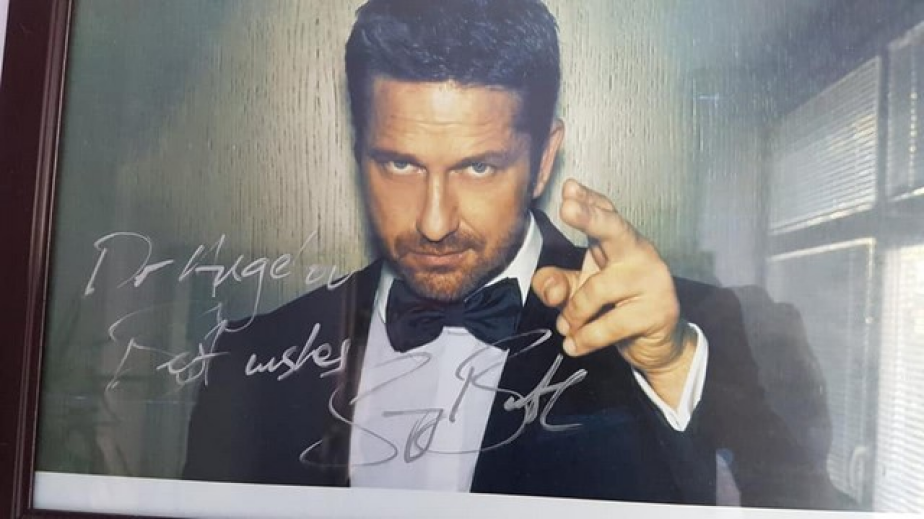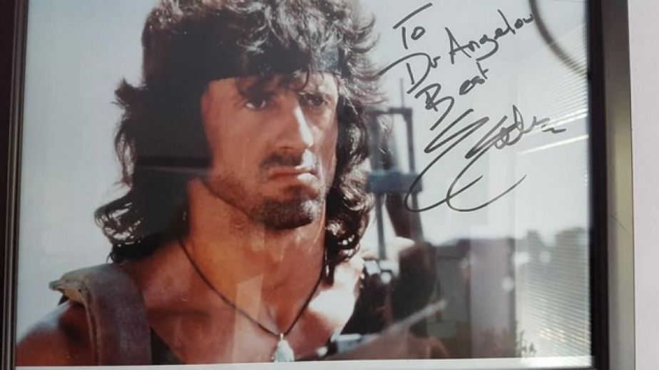 Снимки от личния архив на д-р Ангелов: Снимка за спомен с Дейвид Хаселхоф, както и автографи от Силвестър Сталоун и Джерард Бътлър, след проведен от д-р Ангелов медицински преглед.