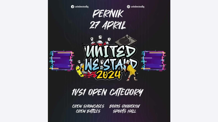 Тази събота /27.04.2024г./, от 11:00 ч. Перник отново ще бъде домакин на отворения национален брейк турнир „UNITED WE STAND“, който е част спортния календар на Българска Брейк Федерация за 2024г. Турнирът, който е един от най-големите в страната се организира от СКБТ "DA CLIQUE" с подкрепата на община Перник и много приятели на един от най-новите олимписки спортове – брейка и ще се проведе в зала „Борис Гюдеров“. Събитието ще даде възможност както на всички картотекирани състезатели, така и на свободни състезатели да вземат участие под формата на танцови битки един срещу един. Най атрактивната част от него, финалите, шоукейсите и отборните битки във всички категории, ще започне в 18:00 ч. Организаторите са подготвили и много изненади, които очакват гостите на събитието.