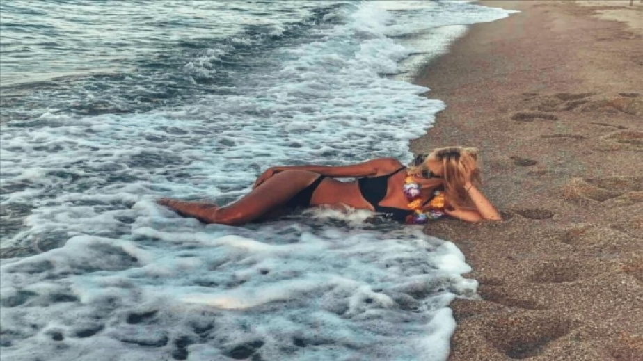 Натали се пусна по черен бански от брега на морето. Красавицата е обливана от морската вода и се чекне в различни пози. /БЛИЦ