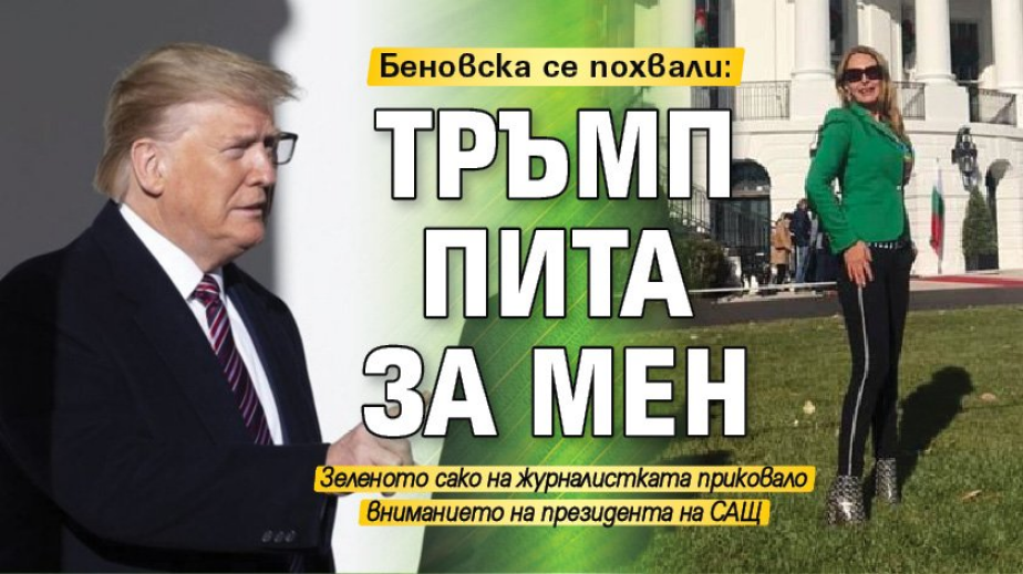 Ето и лаконичната автореклама на Беновска:„Пред Белия дом... Зададох въпрос на президента на САЩ Тръмп. После Борисов каза, че Тръмп попитал: Коя е тази в зеленото? Е, не му дадох ябълка,че...” Към поста си, Беновска пусна и снимка, в която позира с впит черен клин, сребристи боти на точки…и прочутото сако, чийто цвят мнозина определиха като отровнозелен.