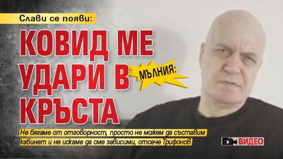 В болничен съм в момента. COVID-19 ме удари в кръста. Аз и без това, заради проблеми с крака, съм с патерица - сега още по-зле, но мисля, че нещата са по-добре. Това каза Слави Трифонов с включване на живо във фейсбук около 20 часа. Той съобщи, че вчера е излязъл от карантината, но в момента е в болнични, информира Lupa.bg