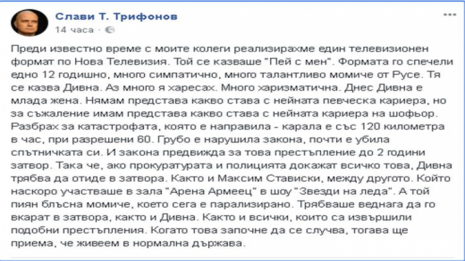 "Преди известно време с моите колеги реализирахме един телевизионен формат по Нова Телевизия. Той се казваше “Пей с мен”. Формата го спечели едно 12 годишно, много симпатично, много талантливо момиче от Русе. Тя се казва Дивна. Аз много я харесах. Много харизматична. Днес Дивна е млада жена. Нямам представа какво става с нейната певческа кариера, но за съжаление имам представа какво става с нейната кариера на шофьор. Разбрах за катастрофата, която е направила - карала е със 120 километра в час, при разрешени 60. Грубо е нарушила закона, почти е убила спътничката си. И закона предвижда за това престъпление до 2 години затвор. Така че, ако прокуратурата и полицията докажат всичко това, Дивна трябва да отиде в затвора. Както и Максим Стависки, между другото. Който наскоро участваше в зала “Арена Армеец” в шоу “Звезди на леда”. А той пиян блъсна момиче, което сега е парализирано. Трябваше веднага да го вкарат в затвора, както и Дивна. Както и всички, които са извършили подобни престъпления. Когато това започне да се случва, тогава ще приема, че живеем в нормална държава."