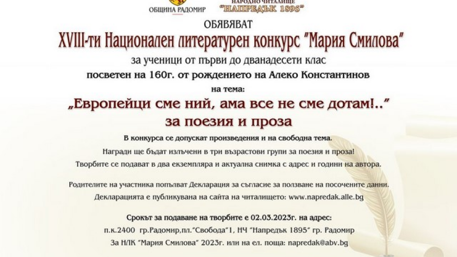 След двегодишно прекъсване в Радомир обявиха XVIII-ти Национален литературен конкурс "Мария Смилова", съобщиха организаторите от НЧ „Напредък“ и Община Радомир. Той е за поезия и проза а темата е „Европейци сме ний,ама все не сме до там!“.
