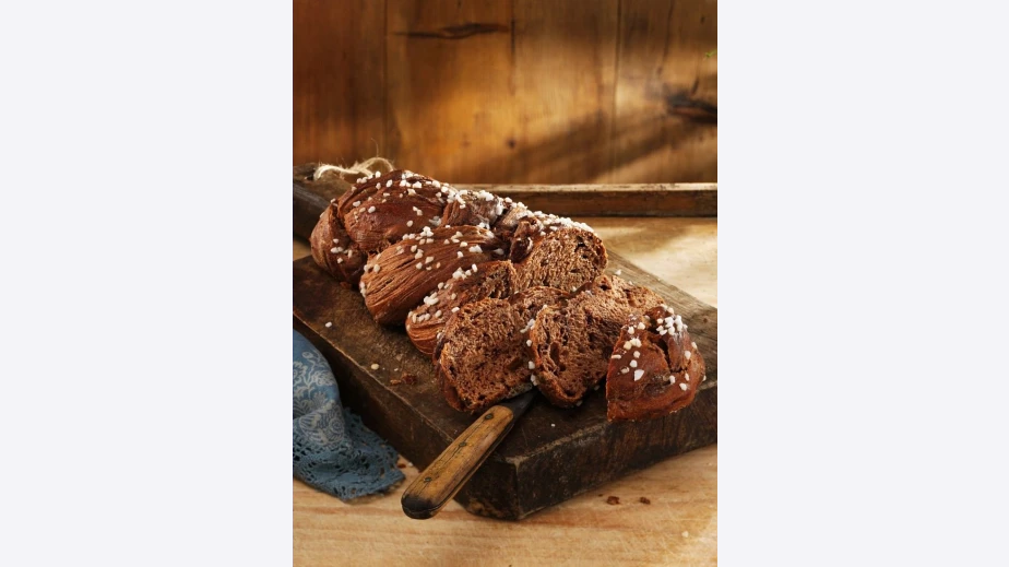 Слага се в тава с хартия за печене. Покрива се и втасва още около 10 мин. Намазва се със сметаната и се поръсва с едрата захар. Може да се гарнира с цели белени лешници.