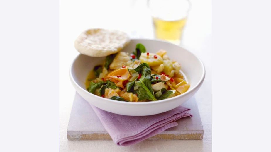 Прибавя се спанакът. Подправя се с кърито, куркумата, сол, червен пипер и лимоновия сок.