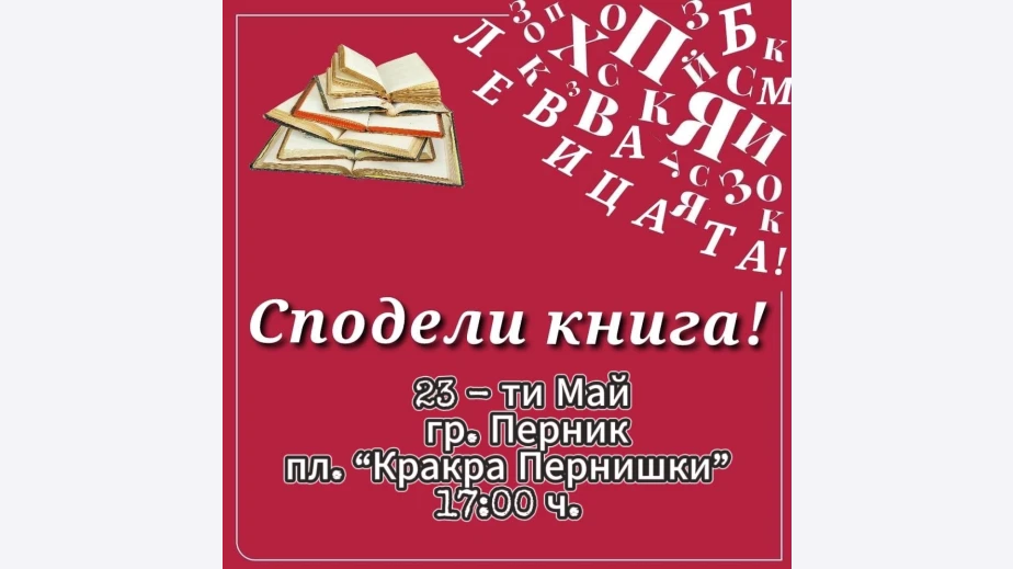 Споделикнига в гр. Перник! Като част от политиката и приоритет на "Левицата!" за достъп до култура на българските граждани, кампанията "Сподели книга" , ще се проведе и в гр. Перник. В рамките на инициативата всеки гражданин може да вземе или остави книга. Защото да се изхвърли книга на боклука е престъпление! Мероприятието ще се състои на 23-ти Май 2024г, от 17:00ч. на пл."Кракра Пернишки"