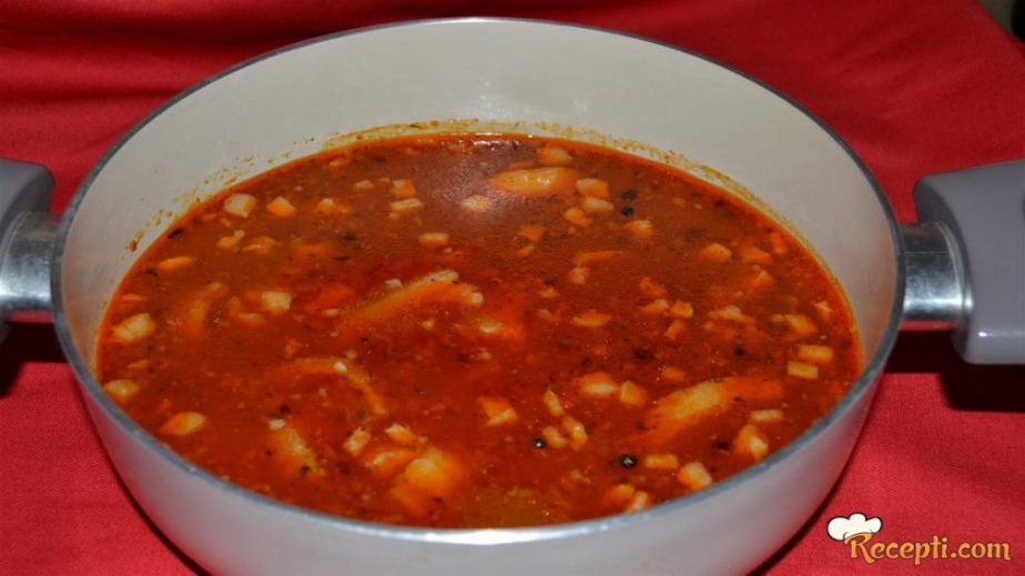 Оставя се да кипне и се добавят чесновата смес, доматеното пюре, чили сосът и се разбърква. Кипва отново и се слага нарязаното шкембе. Готви се на тих огън около 20 мин.