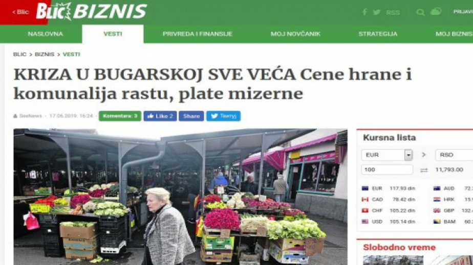 "Кризата в България все по-голяма. Цените на храните и комуналните услуги растат, заплатите мизерни“. Това гласи заглавие на материал в сръбския вестник „Блиц“.