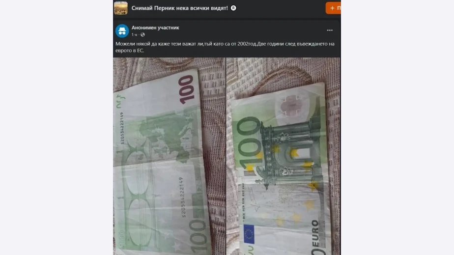 „Може ли някой да каже тези важат ли, тъй като са от 2002 год. Две години след въвеждането на еврото в ЕС?“, пита анонимен перничанин, който е публикувал и снимки на стари банкноти от 100 евро.
