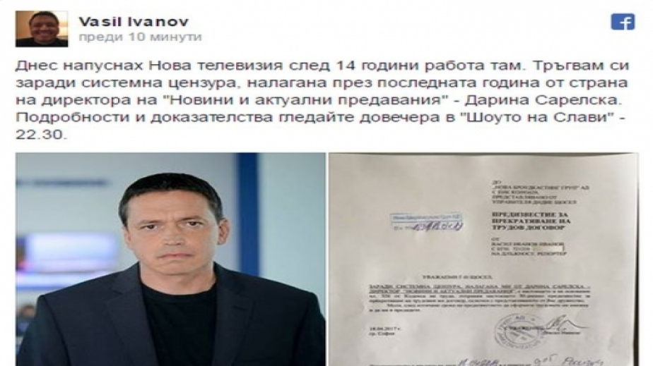 Иванов обяви решението си с пост във Фейсбук, като уточни, че напуска заради „системна цензура“, налагана от директора на „Новини и актуални предавания“ – Дарина Сарелска.