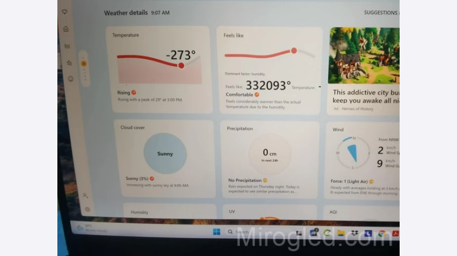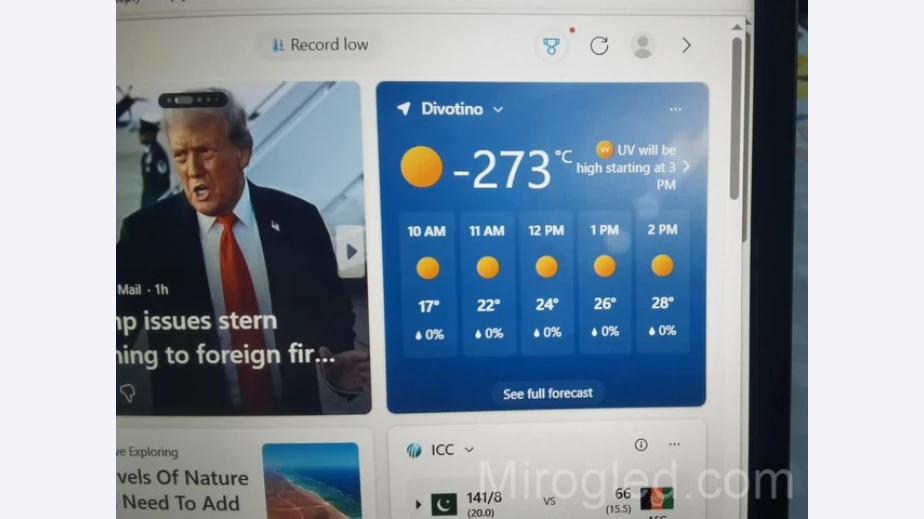 Стряскаща прогноза за времето се появи на компютрите тази сутрин, забелязаха наблюдателни перничани. Според приложението на “Майкрософт“ за прогнозата за времето Weather температурата е -273 градуса, но се усеща значително по-топло заради ниската влажност. Усещането е за 330 796 градуса.