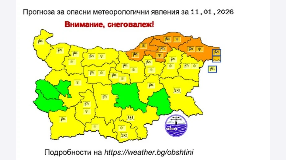 Жълт код за силен вятър е обявен за областите: Благоевград, Видин, Монтана, Пловдив и Сливен. Предупреждение в жълто за силен вятър и за сняг и поледици важи за: Варна, Враца, Велико Търново, Габрово, Ловеч, Пазарджик, Плевен, Търговище и Шумен. Жълт код за валежи от дъжд е в сила за областите Бургас и Хасково, за валежи от сняг за София област и за Смолян, а за Кърджали – от сняг и дъжд.