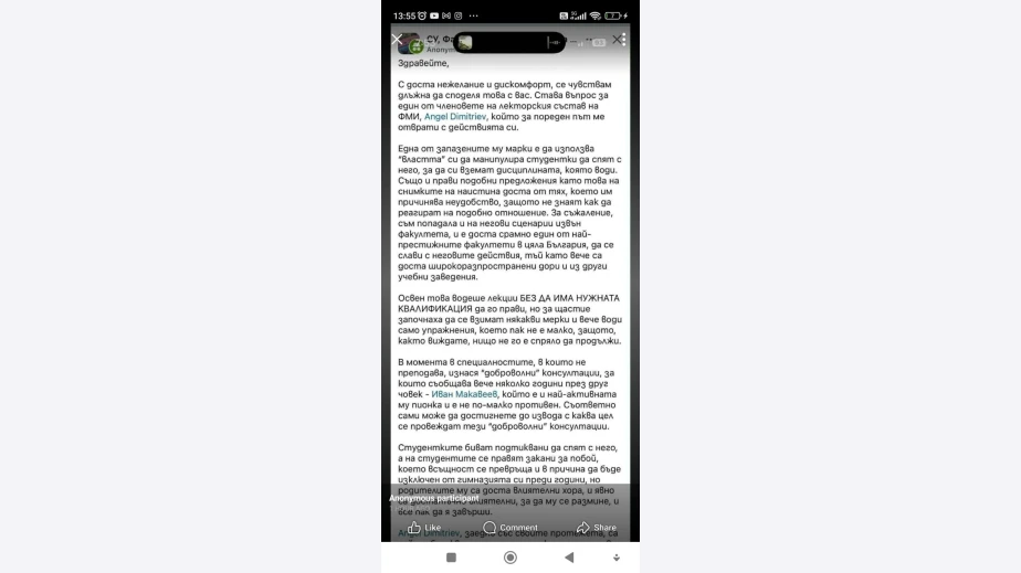 В анонимна публикация се отправи твърдението, че асистентът по "Компютърна информатика" към ФМИ Ангел Димитриев "подтиква студентки да спят с него", използвайки и манипулирайки момичетата с властта си, за да си вземат дисциплината, по която преподава.