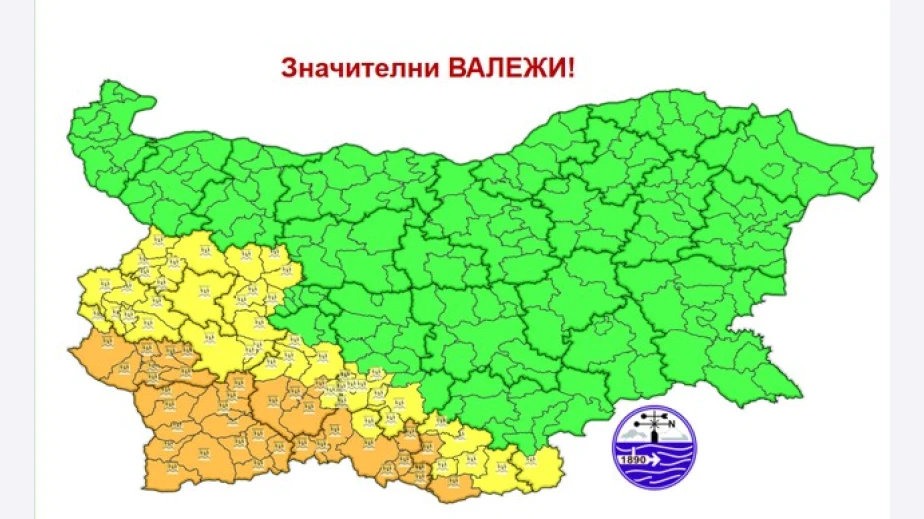Жълт и оранжев код е обявен в четвъртък за значителни валежи в половин България, съобщиха от Националния институт по метеорология и хидрология (НИМХ).