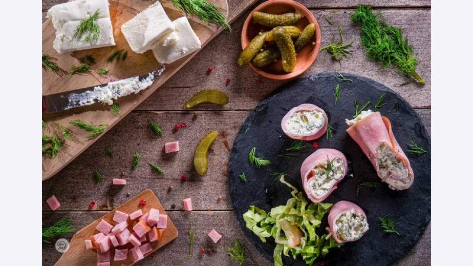 Салата от печени чушки и орехи върху краставица