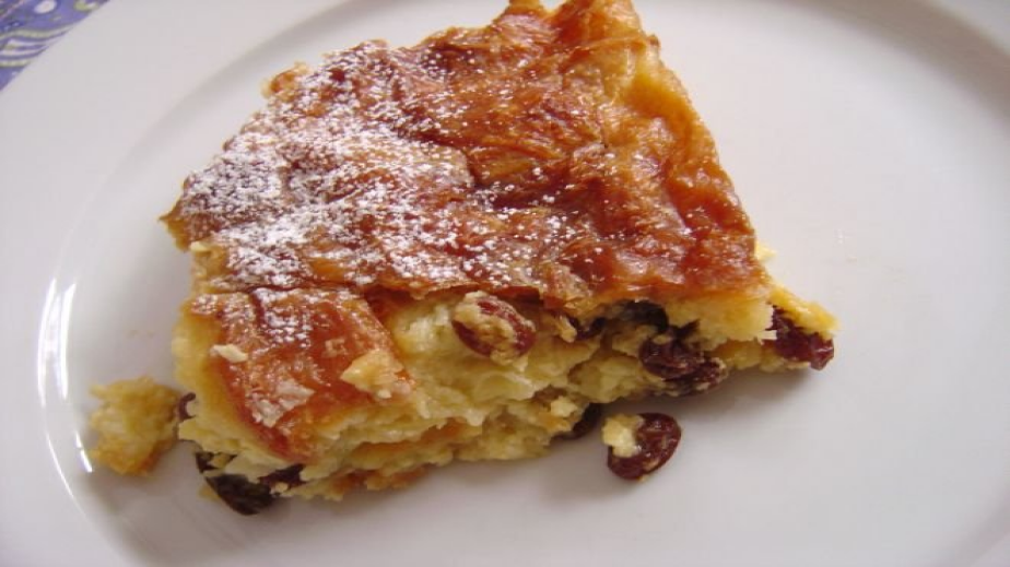 Кроасаните се накъсват и се пържат в 1 ч.л. масло до пожълтяване. Свалят се от огъня и се заливат с горещо вино, за да се получи гъста каша и се оставя да изстине. Разбива се 1 с.л. масло със захарта, жълтъците и настърганата лимонова кора на пяна. Прибавя се кашата, разбитите на сняг 4 белтъка и стафидите. Сместа се изсипва в намазана с масло и поръсена с галета форма. Пудингът се пече в умерена фурна. Поръсете с пудра захар./Рецепта Лакомник.бг