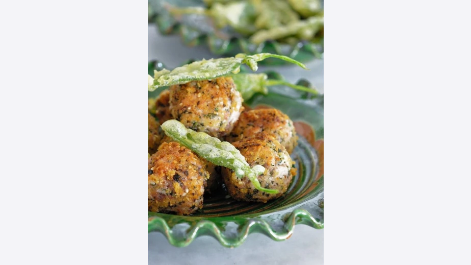 В същата мазнина се изпържват кюфтенцата. Отцеждат се върху кухненска хартия и се гарнират с листенцата салвия.