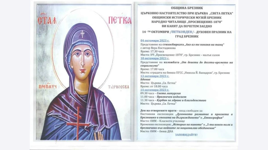 В Брезник предстои да бъде отбелязан духовният празник на града - 14 октомври (Петковден), съобщиха от Общината.