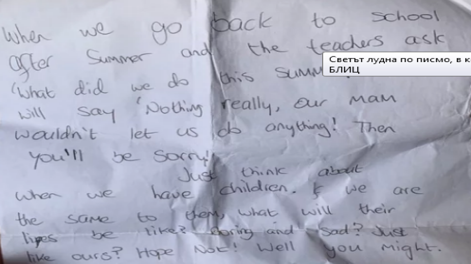 Джон Макини от Дъблин сподели бележка, пълна с ярост, която той е написал със сестра си до майка им, пишат местни медии. Джон и Карла, които тогава били съответно на 8 и 11 години, написали невероятно драматично писмо до майка им. Причината са изхвърлените водни бомби, които развалили лятото им. Петнадесет години по-късно Джон публикува бележката в своя акаунт в Twitter, пише БЛИЦ
