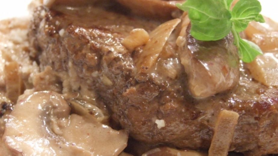 Котлетите се начукват съвсем леко. Овкусяват се от двете страни със сол, черен пипер и кимион на вкус, след което се прибират за около 30 минути в хладилник.Овкусените котлети се запържват за кратко в силно сгорещеното олио, за да се "запечатат". Изваждат се и се прибират на топло. В мазнината от печенето се запържват последователно гъбите, а след това и лукът.В йенската тенджера се редуват ред зеленчуци и малко топено сирене, отгоре се поставят няколко парченца масло. Слагат се котлетите, покриват се с остатъка от зеленчуците и топеното сирене. Прибавя се останалото масло и се залива със зеленчуковия бульон.Ястието се поставя в студена фурна и се пече на 180 градуса около 50 минути, докато топеното сирене се разтопи и попие в по-долните слоеве.Може да поднесете котлетите със свежа салата по избор.