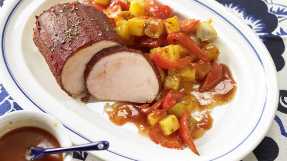 Отваря се внимателно фолиото на печеното свинско и се поливат зеленчуците с образувалия се сос.