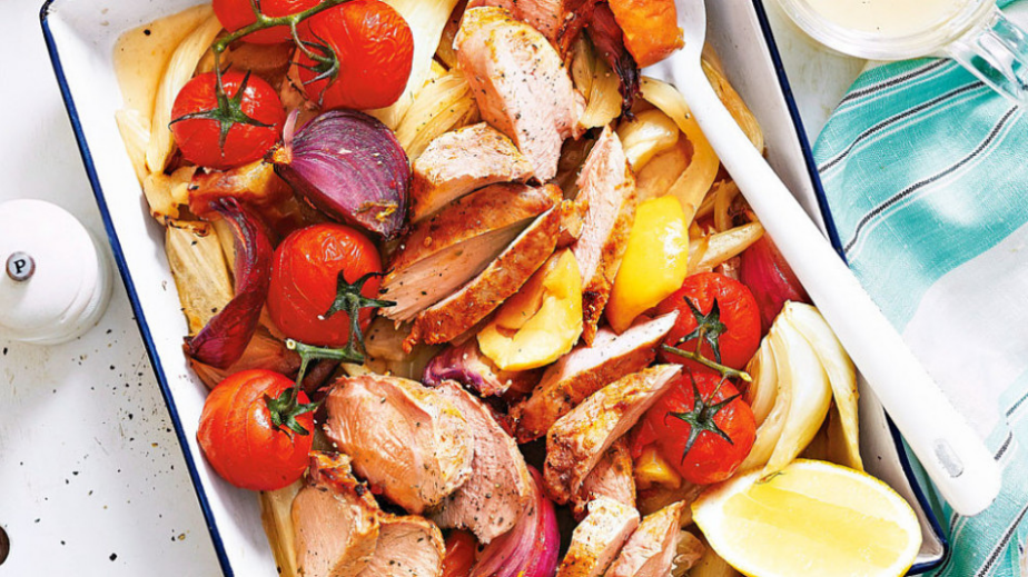 Изчистете ябълките от семките и нарежете на парчета. Изчистете лука и го нарежете на едро. Празът нарежете на колелца. Смесете зеленчуците с месото, сложете всичко в тава, поръсете с малко сол и залейте с олио. Покрийте тавата с фолио и запечете за 20 минути. След това свалете фолиото, залейте с бульона, отгоре подредете чери доматките и запечете за още 15 минути.