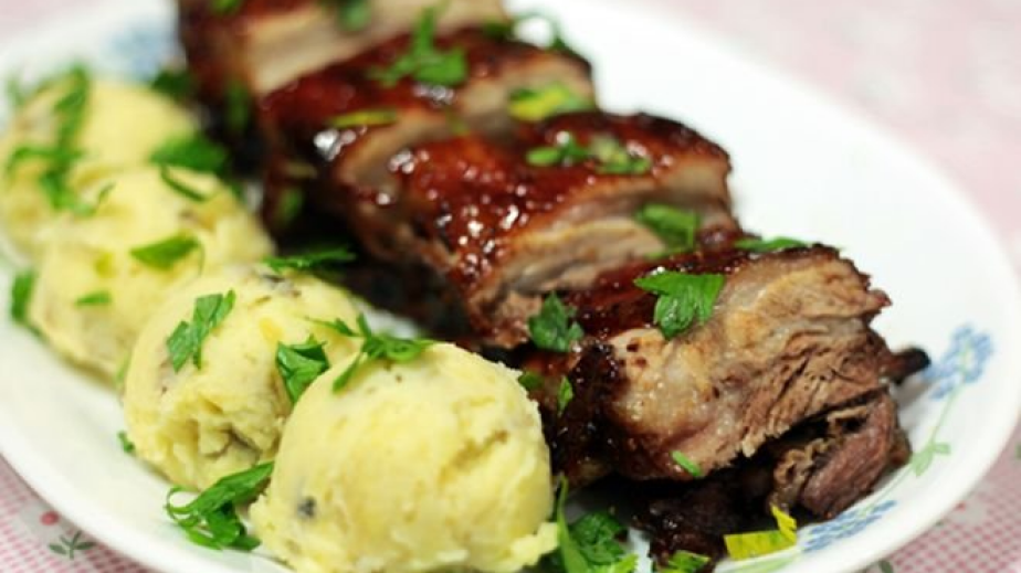 Картофите се белят, измиват и слагат в тенджера. Налива се вода колкото да ги покрие и се оставят да заврят. С вилица се проверява дали са омекнали. Трябва да омекнат като за пюре. Накрая се добавят розички броколи. Зеленчукът е нежен и е достатъчно пет- десет минути да кипне във врящата, картофена вода. След готовност съдът се оттегля. Зеленчуците се отцеждат добре от водата. Смачкват се на пюре. То се овкусява със сол и краве масло. Сервират се месни хапки, задушен лук и оформени топки зеленчуково пюре. Месцето се полива със сосче, останало от печенето.