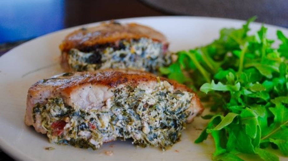 В тиган с незалепващо покритие се запържва ситно нарязания чесън за около минута. Добавя се спанака и се овкусява със сол и черен пипер. Задушава се докато се изпари водата от спанака. Накрая се добавя се настърганото сирене фета, крема сиренето и горчицата. Разбърква се добре. На всяка пържола се прави разрез. С получената плънка се пълнят пържолите. Подреждат се в тава и се овкусяват със сол и черен пипер. Пекат се в предварително загрята на 200С фурна до златисто. Поднесете с гарнитура по желание.