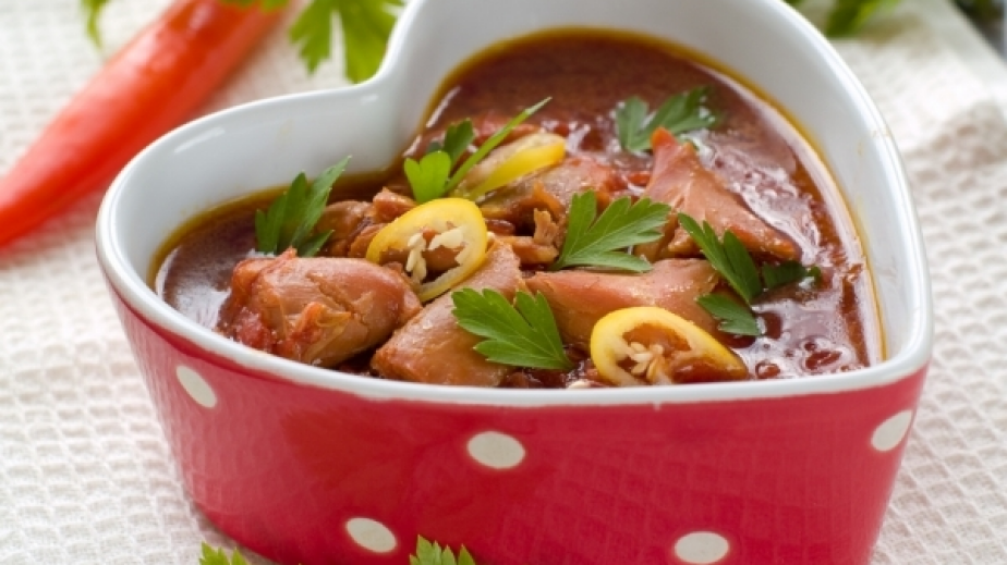Нарежете месото на средни по големина парчета и го сварете в подсолена вода за около. Обелете лука и го нарежете на едро.След това го сложете на скара или котлон да се изпече и го прибавете към телешкото, което продължавате да варите. След 5 минути сипете вътре доматеното пюре, олиото, черният и червеният пипер.След още 5 минути свалете ястието от огъня. Разделете го на 4 порции.Сервирайте на вашите гости, докато е още топло. По желание може да гарнирате с пюре от глави целина, което се приготвя на същия принцип, както и картофеното пюре.