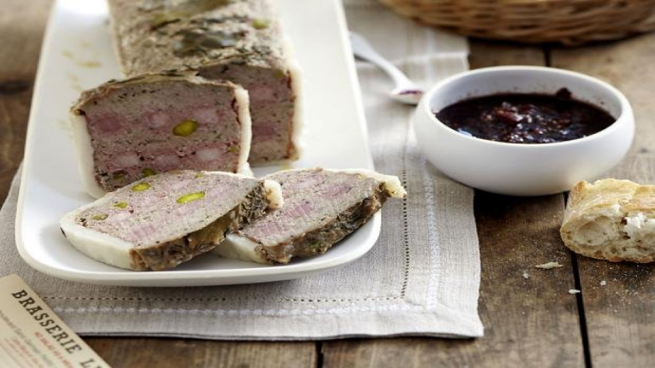 Продълговата дълбока форма се покрива – дъното и стените, с тънките филийки бекон. Слага се добре уплътнена 1/3 от месната смес и се покрива с половината от шунката. нарязана на тънки ленти. Разстила се втората третина от месната смес и останалата шунка. Най-отгоре - последната част от месната смес. като се заглажда.